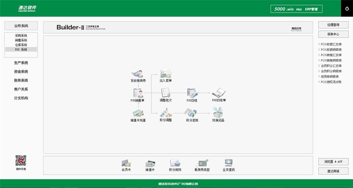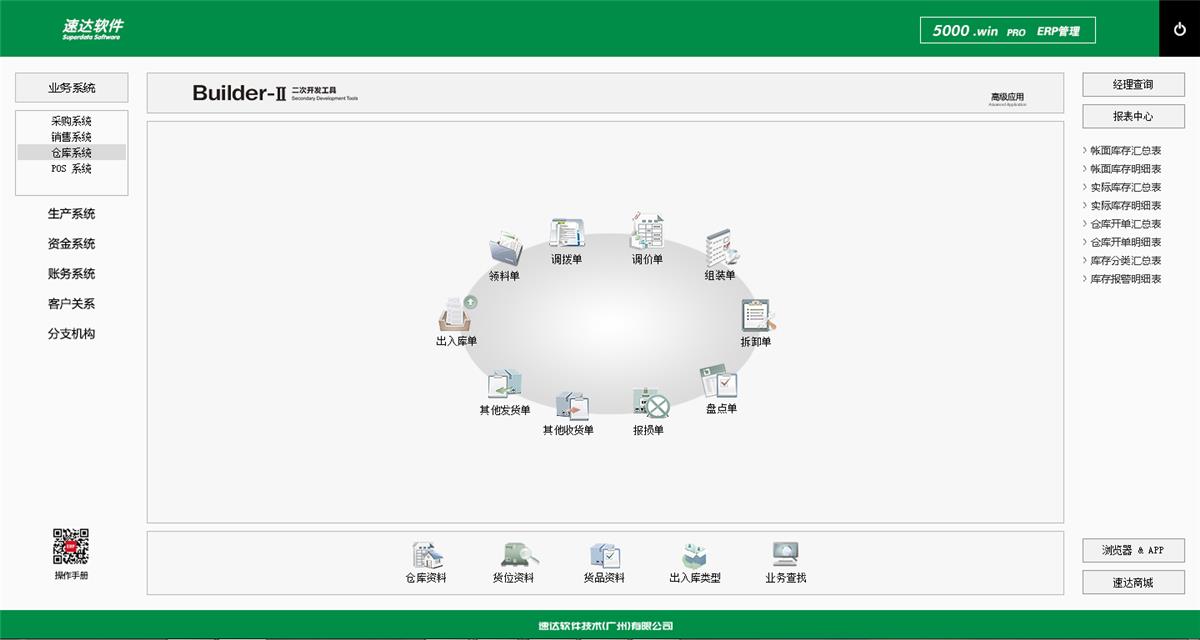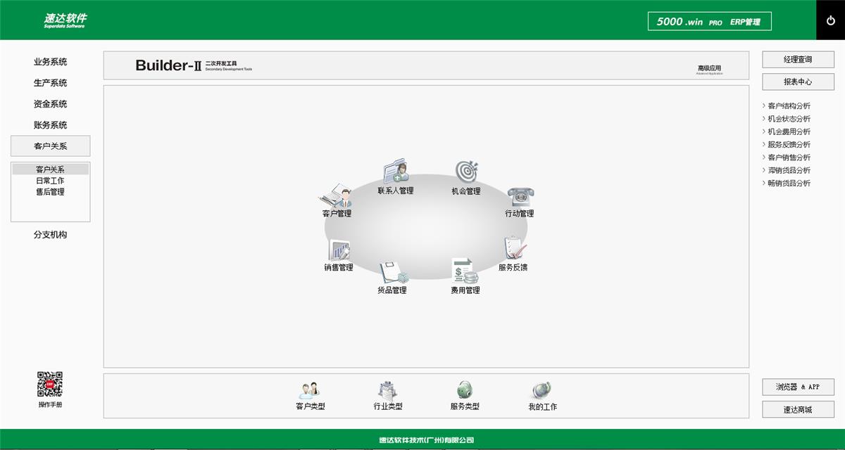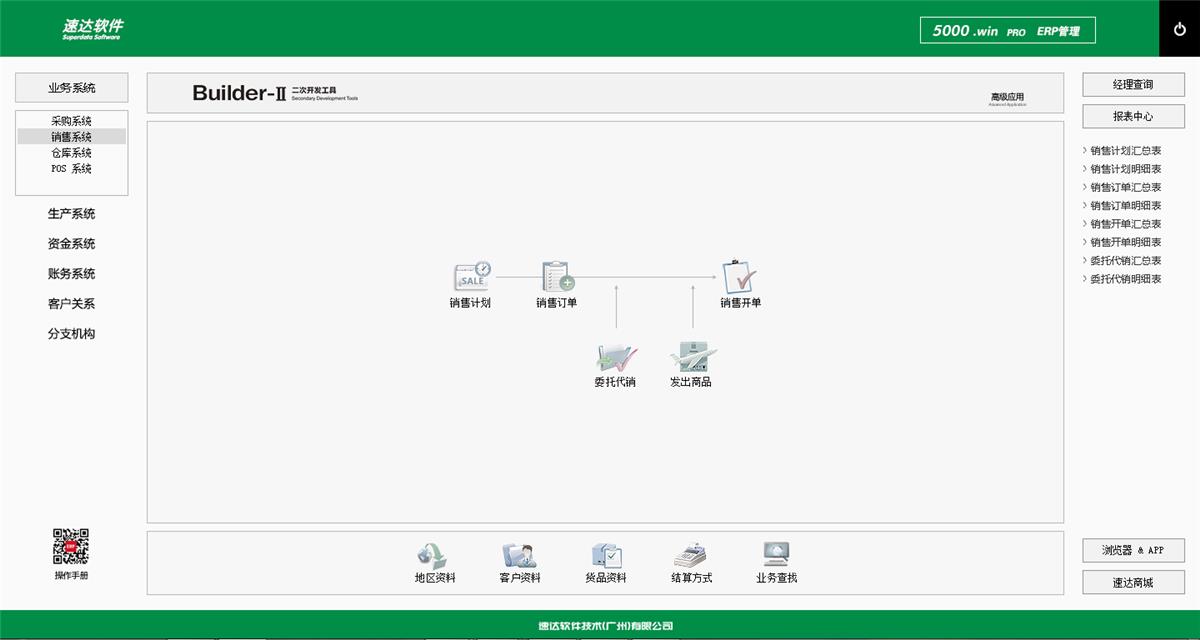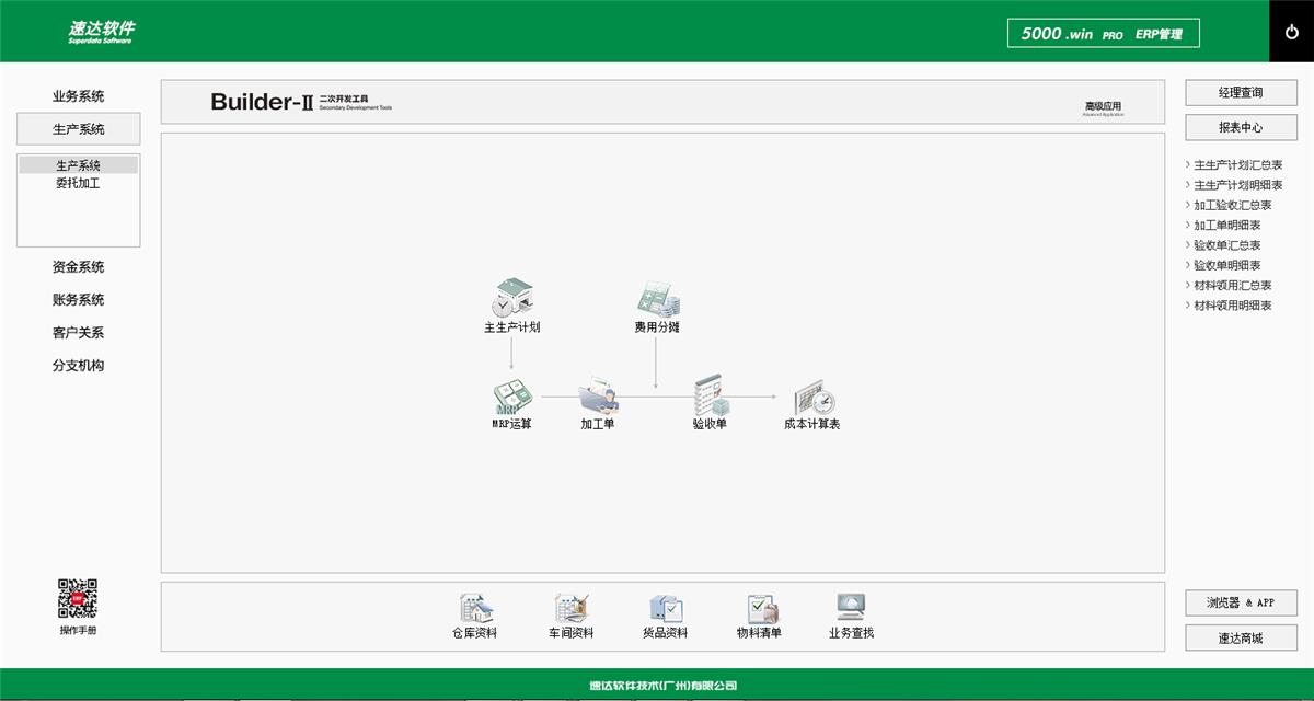 《速达5000 Win. PRO》作为ERP管理软件,特别适合中型企业使用。软件支持云部署和桌面服务器部署及APP部署,并科学地融入Builder-II二次研发工具, 高度满足企业应用需求,大大提升了应用效率和安全性。软件全面实现供应链业务管理、生产管理、资金管理、财务 管理、客户关系管理、异地分销、远程配送、多机构集团化管理。支持局域网/互联网多用户应用,实现异地多机构、 多店面、多仓库等远程应用,同时支持APP移动终端应用,数据实时同步,安全、稳定、高效。