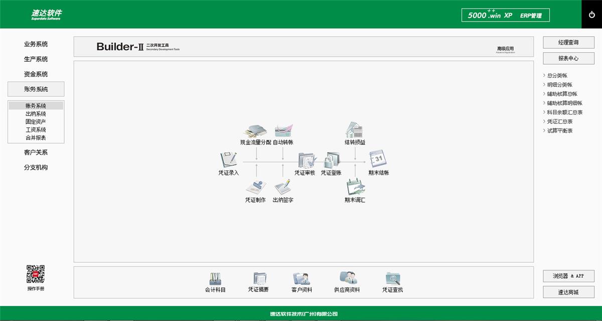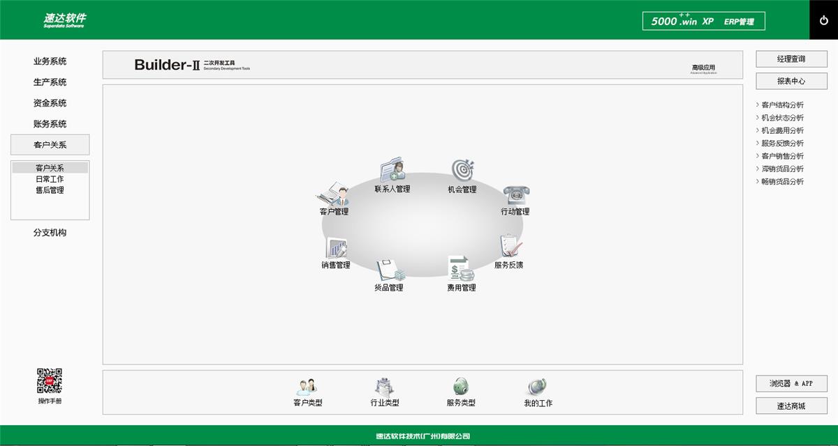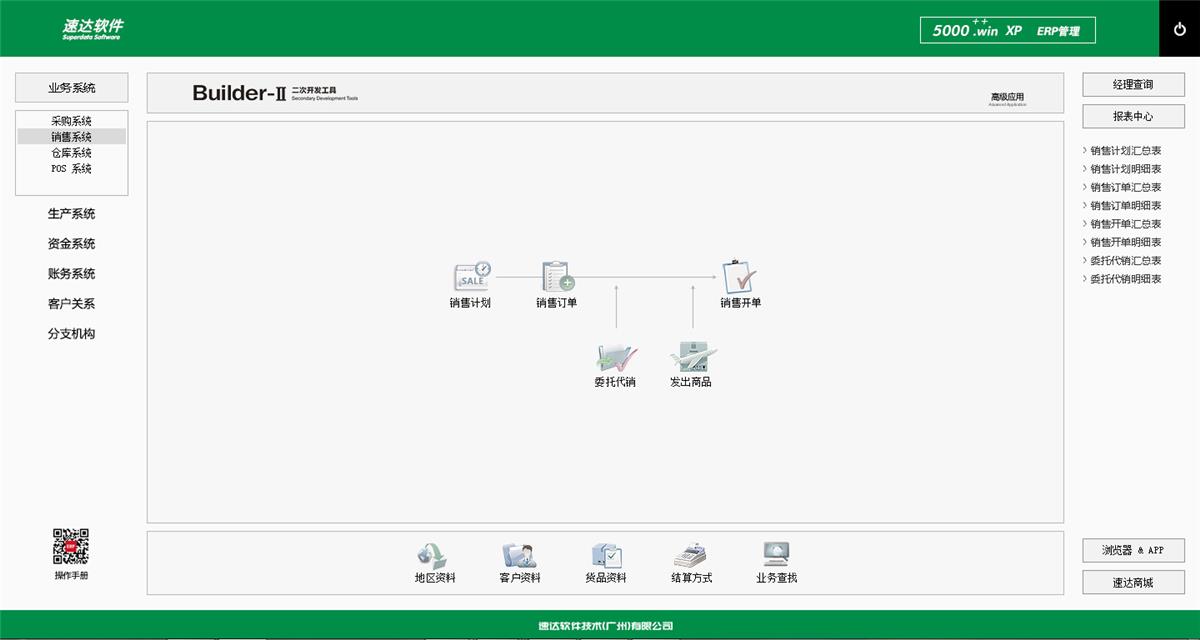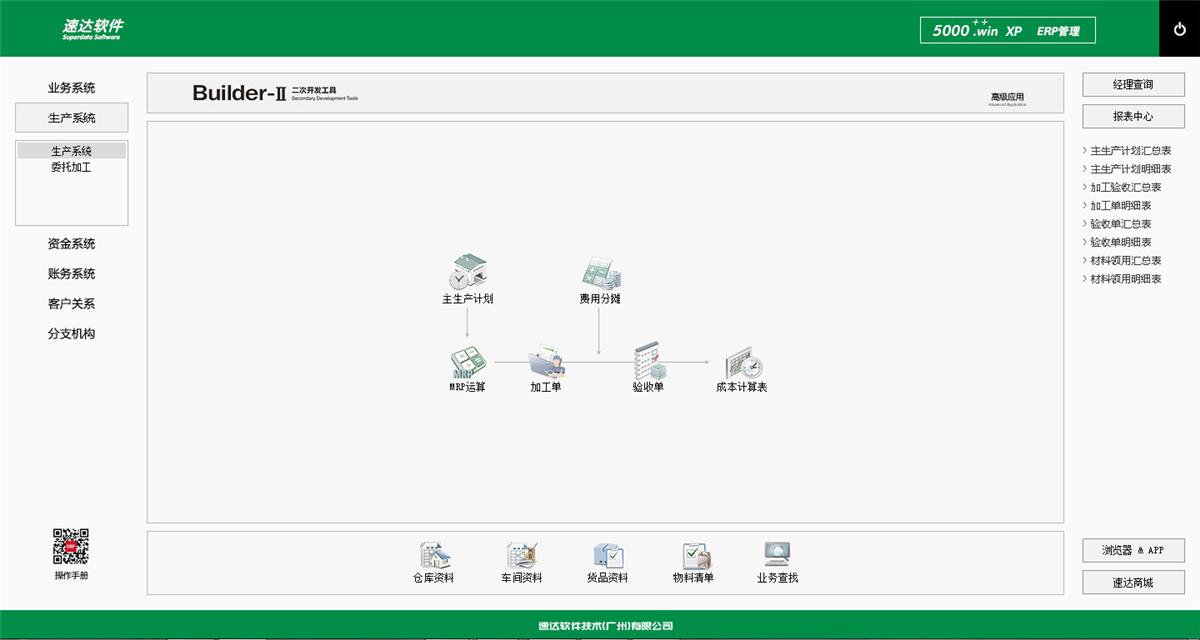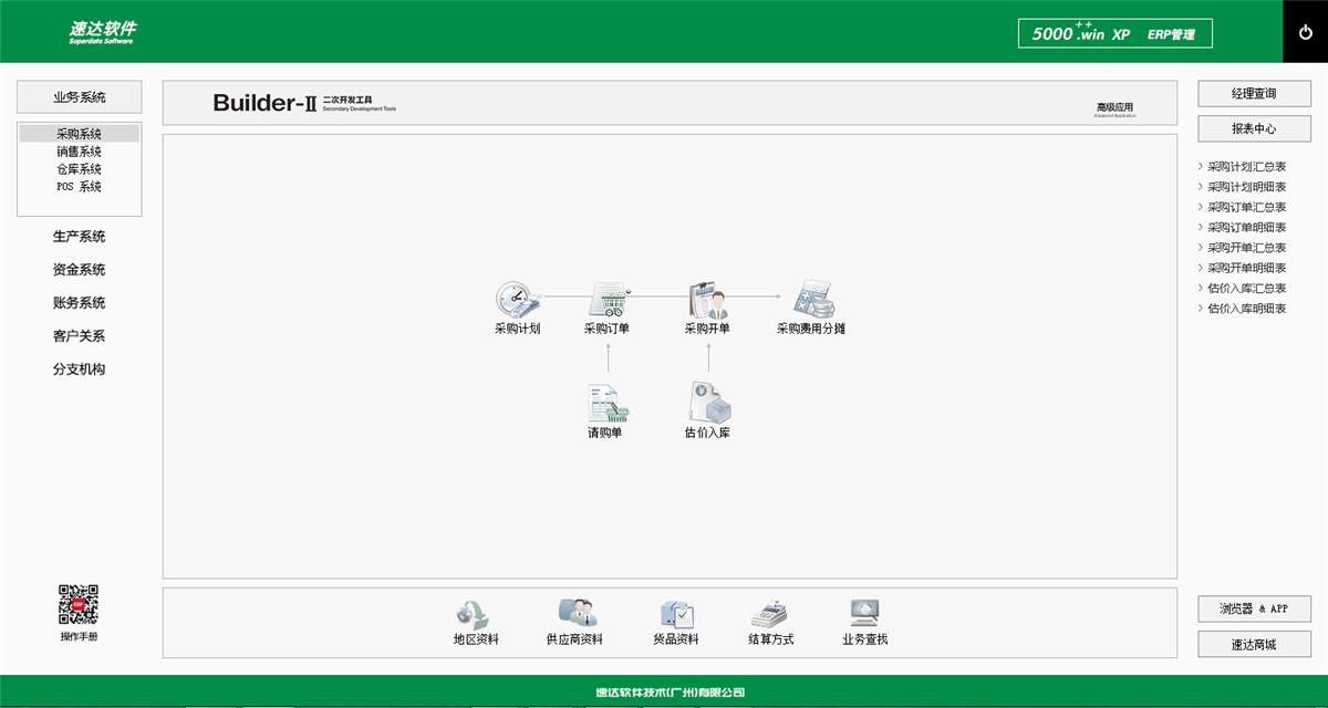 《速达5000 Win. XP 是速达软件公司最新推出的企业级ERP系统。系统支持云部署和桌面服务器部署及APP部署, 并科学地融入Builder-II二次研发工具,满足企业管理的个性化需求,大大提升了应用效率和安全性。将企业供应链、POS、财务、生产、客户关系、项目管理集成于一体并科学的结合“云”技术,系统同时支持IE浏览器、WIN桌面端、APP移动应用等多种应用模式。真正满足企业管理的个性化需求,全面提升企业综合管理水平。